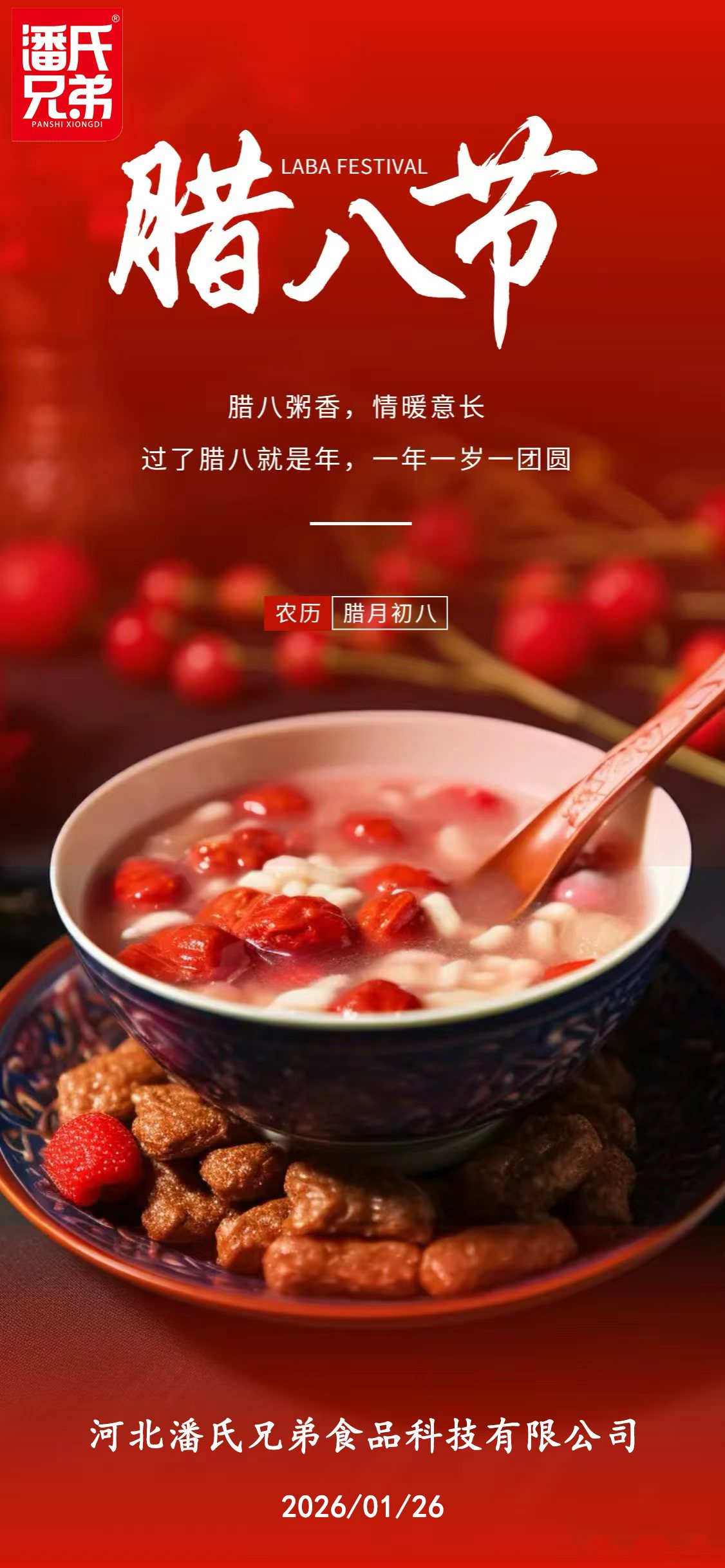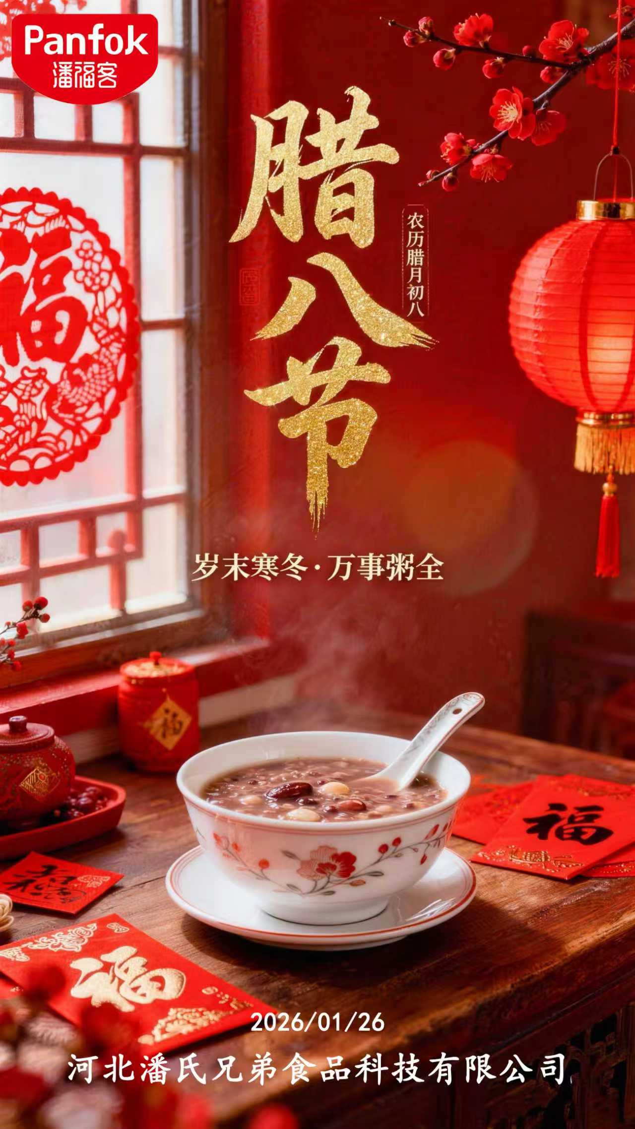 河北潘氏兄弟食品科技有限公司,以食为媒,以暖为念,在这寒岁时节,愿以匠心滋味,伴你共品腊八温情。愿这碗暖粥,驱散冬日寒凉,温润岁月日常;愿腊八一过,年味渐浓,事事“粥”全,岁岁长安。祝大家腊八安康,新年顺遂,万般美好皆如期.