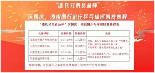 为庆国庆、颂祖国,促进广大群众的身心与智力的健康发展,打造健康和谐的体育文化氛围,由河北潘氏兄弟食品科技有限公司举办的乒乓球比赛于2021年10月国庆节期间在石家庄四个场馆拉开帷幕。本次比赛设有混合单打和二人团体,20支乒乓球爱好者组成的队伍参加此次比赛。